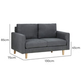 Overall 85cm H x 130cm W x 75cm D Seat 45cm H x 112cm W x 50cm D 2 Seater Sofa 85cm H x 130cm W x 75cm D Arm 61.5cm H x 12.5cm W Seat Back Height 46cm Clearance from floor to bottom of Product 18cm Overall Product Weight 27 Kilograms Recommended Weight Capacity (Sofa) 240 Kilograms