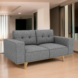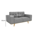 Features Type: Sofa Primary Colour: Light Grey Comfort Level: Medium Shape: Standard Sofa Frame Material: Solid WoodFrame Material Details: Eucalyptus wood Legs Material: Solid WoodLegs Material Details: Rubberwood Upholstery Material: FabricUpholstery Material Details: 100% polyester linen Seat Padding Material: High-density foam Back Padding Material: Doll cotton & crushed foam Seat Suspension Type: SpringsSuspension Details: Pocket spring Armless: No Seat Cushion(s) Removable: No Back Cushion(s) Removable: Yes Seating Capacity: 2 Foot Pads Included: YesFoot Pads Type: Screw-on felt pads Back Type: Cushion Back Style: MidCentury; Scandinavian Pattern: Solid Box Contents: 1 x sofa Button Tufted: Yes Care Instructions: Do not use strong liquid cleaners; do not drag or push after; always lift the item when moving it  Assembly Assembly Required: YesType of Assembly: MinimalRecommended Persons Required for Assembly: 1Assembly Details: Screw on legs only  Limited warranty Product Warranty: 1 Year  StyleThe Jagoda 2 Seater Upholstered Sofa is a MidCentury or Scandinavian style product. Scandinavian style is exemplified by clean-lines, simple, and functional. Scandinavian interiors feature bright white on floors, fabrics, and walls.While, unpainted, light wood furniture that embraces the natural grain adds much-needed warmth to spaces. Sleek, utilitarian furniture without much embellishmentis a mainstay in this minimalist style with a modern flair. You can shop for more MidCentury or Scandinavian Sofas & Lounge Sets in the Furniture section of our site.