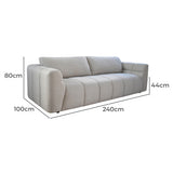 Overall 80cm H x 240cm W x 100cm D Seat 44cm H x 183cm W x 56cm D Arm 66cm H x 28cm W Clearance from floor to bottom of Product 5cm Overall Product Weight 61.4 Kilograms Recommended Weight Capacity (Sofa) 330 Kilograms