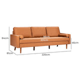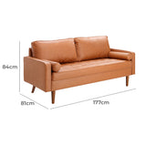 Features Type: Sofa Primary Colour: Brown Comfort Level: Medium to Firm Shape: Standard Sofa Frame Material: Solid Wood; Manufactured WoodFrame Material Details: Rubberwood, plywood Legs Material: Solid WoodLegs Material Details: Rubberwood Upholstery Material: Faux LeatherUpholstery Material Details: Polyurethane leather Seat Padding Material: Pocket spring with foam Back Padding Material: Foam, polypropylene fibre Seat Suspension Type: SpringsSuspension Details: S-spring Armless: No Cushions Included: Yes Seat Cushion(s) Removable: No Back Cushion(s) Removable: Yes Foot Pads Included: YesFoot Pads Type: Felt pads Additional Floor Protectors Advised for Wooden Floors: Yes Back Type: Cushion Back Style: Mid Century; Scandinavian Pattern: Geometric Care Instructions: Spot clean Seating Capacity (3-Seater Seating Capacity): 3 Seating Capacity (4-Seater Seating Capacity): 4 Assembly Assembly Required: Yes  Limited warranty Product Warranty: 3 Years  Style The Tan Stockholm Faux Leather Sofa is a Mid Century or Scandinavian style product. Scandinavian style is exemplified by clean-lines, simple, and functional. Scandinavian interiors feature bright white on floors, fabrics, and walls. While, unpainted, light wood furniture that embraces the natural grain adds much-needed warmth to spaces. Sleek, utilitarian furniture without much embellishment is a mainstay in this minimalist style with a modern flair. You can shop for more Mid Century or Scandinavian Sofas & Lounge Sets in the Furniture section of our site.