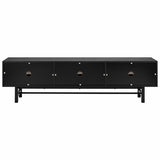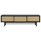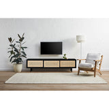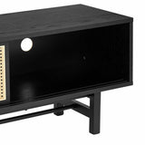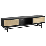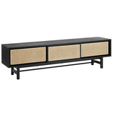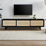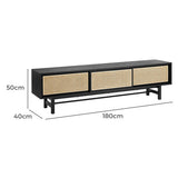 Features: Materials: MDF with black stained oak veneer finish, rattan door panels Includes: 1 x TV unit, 1 x set of assembly parts, 1 x assembly manual Real natural rattan sliding door panels 3 x cable holes for electronic storage Sliding doors can be moved to give the appearance of 3 doors or just 2 Has a beautiful timber joinery detail on legs We've tested it for you - the surface is resistant to liquids & staining, just be sure to wipe up spills as soon as possible Distance between legs from the longer side: 145.4cm WARNING Children have died from furniture toppling over Always secure your television with an anchor deviceNever allow children to stand, climb or hang on drawers, doors, or shelves