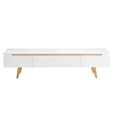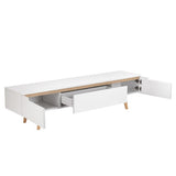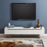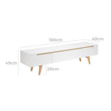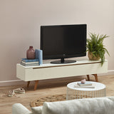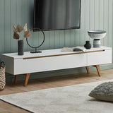 Features: Materials: MDF frame, solid oak legs Ample storage space Sleek, Scandinavian-inspired design Matte gloss finish Can hold up to 15kg With hole for electric wiring WARNING Children have died from furniture toppling over Always secure your television with an anchor deviceNever allow children to stand, climb or hang on drawers, doors, or shelves