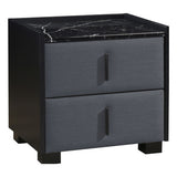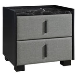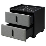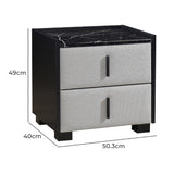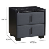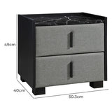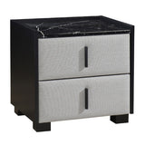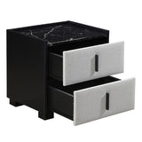 Features: Materials: MDF with faux marble finish tabletop, particleboard & MDF frame, 100% polyester drawer panel upholstery, PVC plastic handles Includes: 1 x bedside table, 1 x set of assembly parts, 1 x assembly manual Adds a luxurious touch to your bedroom Perfect for a bedside lamp & is a must-have in all bedrooms Its faux marble-finished tabletop adds instant elegance Stylish handle 2 x spacious drawers