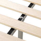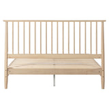 Features: Materials: washed pine wood, steel, plywood slats Includes: 1 x bed frame, plywood slats Heavy duty timber frame Beautiful European-style spindle headboard Flat slatted mattress support also provides air flow for a healthier mattress Smoothly finished timber elements lend elegance to the furniture Sturdy design with a light appearance All hardware included Distance from the top of the bed base to the top of the bed head is 74.5cm