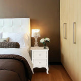 Features: Materials: MDF tabletop & frame, stainless steel handles, metal hardware Includes: 2 x bedside tables Sturdy & durable Easily matches with any decoration & other furniture Classic retro look that adds charm & elegance to your room Keeps your bedside essentials organized Centre metal gliders for easy drawer access