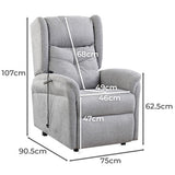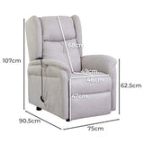 Features: Materials: 95% polyester & 5% nylon upholstery, high-density foam padding, eucalyptus wood & steel frame Includes: 1 x recliner armchair, 1 x set of assembly parts, 1 x assembly manual Perfect for living rooms, bedrooms, theatre rooms & media rooms Constructed from high-quality hardwood & steel frame Easy control with 4 button wired remote control Backrest & foot rest can be adjusted separately Ergonomic design for full-body support The curved armrest adds extra comfort Reclining mechanism: remote control Comes with a side storage pocket Lift function to help you stand up Powerful dual motor control Reclines up to 160° Dimensions when fully expanded: H67 x W75 x D177.5cm Seat area plus foot rest dimensions: W46 x D106cm Backrest dimensions: H68 x W46cm Height when lifted: 134cm Product Details: Recommended Weight Capacity: 140 Kilograms