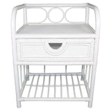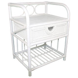 Features Shape: Rectangular Frame Material: Rattan; Solid WoodFrame Material Details: Natural rattan Tabletop Material: RattanTabletop Material Details: Woven rattan Storage Type: Drawers; ShelvingNumber of Drawers: 1 Drawers/Shelves Included: Yes Style: Bohemian; Coastal Box Contents: 1 x bedside table, 1 x drawer Care Instructions: Wipe clean with a dry clothCare Instructions Details: Wipe clean with a dry cloth Assembly Assembly Required: No  Limited warranty Product Warranty: 1 Year  StyleThe Venezio Rattan Bedside Table is a Bohemian or Coastal style product. Coastal style is exemplified by perfect for a beach or lake house or coastal design features whites, blues, and sandy neutrals. Motifs such as shells, coral,sea life and nautical instruments complete the look. You can shop for more Bohemian or Coastal Bedside Tables in the Furniture section of our site.