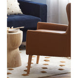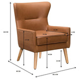 Features Type: Wingback Chair; Armchair Frame Material: Manufactured WoodFrame Material Details: Plywood Legs Material: Manufactured WoodLegs Material Details: Rubberwood Upholstered: Yes Upholstery Material: Faux LeatherUpholstery Material Details: 100% PUSeat Padding Material: High-density foamBack Padding Material: High-density foam Seat Cushion(s) Removable: Yes Back Cushion(s) Removable: No Removable Cushion Cover: No Machine Washable Cushion Cover: No Primary Colour: Brown Style: Scandinavian; Mid Century Foot Pads Included: YesFoot Pads Type: Hard plastic & rubber pads Additional Floor Protectors Advised for Wooden Floors: No Pattern: Solid Comfort Level: Medium Box Contents: 1 x armchair Recommended Weight Capacity: 120 Kilograms Care Instructions: Wipe clean with a dry cloth; immediately wipe any spills to prevent staining Assembly Assembly Required: YesType of Assembly: MinimalRecommended Persons Required for Assembly: 1Assembly Details: Refer to the assembly instruction Limited warranty Product Warranty: 5 years StyleThe Jacob Faux Leather Wingback Armchair is a Scandinavian or Mid Century style product. Scandinavian style is exemplified by clean-lines, simple, and functional. Scandinavian interiors feature bright white on floors, fabrics, and walls.While, unpainted, light wood furniture that embraces the natural grain adds much-needed warmth to spaces. Sleek, utilitarian furniture without much embellishmentis a mainstay in this minimalist style with a modern flair. You can shop for more Scandinavian or Mid Century Armchairs in the Furniture section of our site.