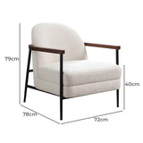 Features: Materials: stainless steel frame & legs, eucalyptus wood armrests, polyester bouclé upholstery, high-density foam padding Includes: 1 x armchair Mid-high backrest & wooden armrests High-quality solid foam under fabric upholstery Sturdy metal frame construction Elevated by metal legs Contemporary design Slim armrests mean it will be a great fit for smaller spaces Product Details: Recommended Weight Capacity: 150 Kilograms