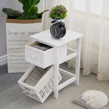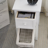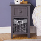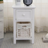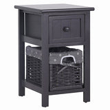 Features: Materials: MDF frame & tabletop, pine wood legs, wicker basket Includes: 1 x bedside table, 1 x wicker basket, 1 x set of assembly parts, 1 x manual Stylish & compact bedside table with chic design Finished with water-resistant treatment for easy cleaning Wood material contributes to the durability & sturdiness Well-knit storage wicker basket Wicker basket lining is removable & washable for your convenience