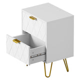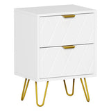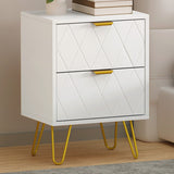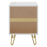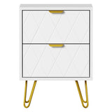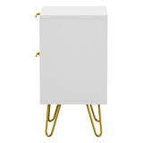 Features: Materials: MDF with painted finish frame and tabletop, steel drawer runners, stainless steel assembly hardware, iron handles and legs Includes: 1 x bedside table, 1 x assembly manual, 1 x set of assembly hardware Eclectic white and gold design adds elegance to any room Two spacious drawers with smooth metal runners for easy use MDF construction with painted finish for a sleek, refined look