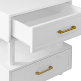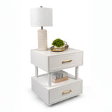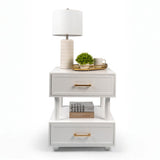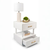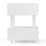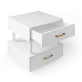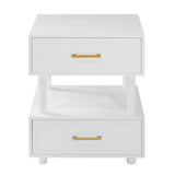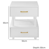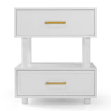 Features: Materials: pine wood frame, solid brass handles, steel drawer runners Includes: 1 x bedside table, 1 x anti-topple kit, 1 x hardware kit, 1 x assembly manual Sleek and luxurious design for an elegant bedroom Two spacious drawers with smooth runners for easy access Comes with stylish brass handles Generous shelf space for storing bedside essentials Combines style and functionality perfectly