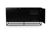 The buffet sits sturdily upon black metal frame legs, while the striking black cabinet features elegant and subtle design detailing on the front doors and is finished with contrasting gold handles.