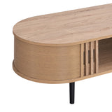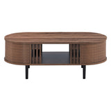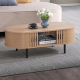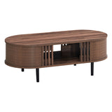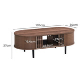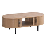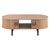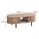 Features: Materials: particleboard with paper laminate finish frame, polypropylene legs Materials: 1 x coffee table, 1 x set of assembly parts, 1 x assembly manual Elegant coffee table with unique, slatted design Rounded ends & dual-sided internal storage access Curved design complements any interior space