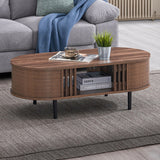 Features Table top Shape: Oval Frame Material: Manufactured Wood Tabletop Material: Manufactured WoodTabletop Material Details: Particleboard with paper laminate finish Open Storage: Yes Pieces in a Set: 1 Style: Contemporary Hardware Material and Finish: Steel Painted Finish: No Box Contents: 1 x coffee table, 1 x set of assembly parts, 1 x assembly manual Care Instructions: Wipe with a clean, dry cloth Assembly Assembly Required: YesType of Assembly: FullRecommended Persons Required for Assembly: 2Assembly Details: Assembly instructions included with the product  Limited warranty Product Warranty: 1 Year  Specifications Commercial Use: No  StyleThe Aldana Coffee Table is a Contemporary style product. Contemporary style bridges the gap between traditional and modern. Pieces feature simple and clean lines with smooth surfaces without any carving or adornment. You can shop for more Contemporary Coffee Tables in the Furniture section of our site.