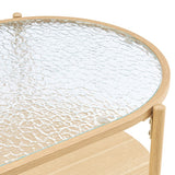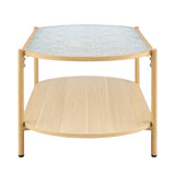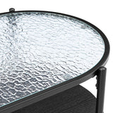 Features: Materials: powder-coated steel with woodgrain finish frame and legs, MDF with melamine finish lower shelf, tempered glass tabletop, steel hardware Includes: 1 x coffee table, 1 x set of hardware kit, 1 x assembly manual 0.5cm thick tempered glass top with a water wave pattern for a sleek and contemporary finish MDF shelf with a melamine finish for enhanced storage and durability Sturdy steel frame for long-lasting support Easy assembly with instructions included