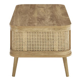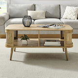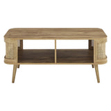 Features: Materials: particleboard with paper laminate finish frame, rattan mesh, pine wood legs Includes: 1 x coffee table, 1 x set of assembly parts, 1 x assembly manual Elegant coffee table with a distinctive curved design Crafted from realistic wood-grain laminate for a stylish & durable finish Curved ends with natural woven rattan inlay for added style Two open shelf areas for displaying décor or storing essentials Blends functionality with sophisticated charm for any living space