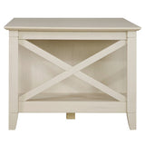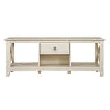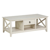 Features: Materials: laminated MDF tabletop, laminated particleboard frame Includes: 1 x coffee table Elegant metal drop pull hardware finished in tumbled pewter Box drawer & lower cubby to store TV remotes, reading materials & more Extra cubby storage at the back of the unit Tapered legs, curved base rails, decorative wood details & vertical accents