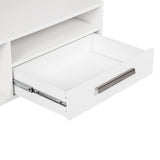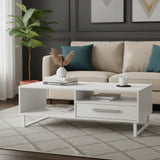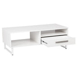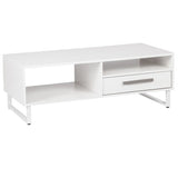 Features: Materials: MDF with melamine finish Includes: 1 x coffee table Crisp white melamine finish tabletop Left hand side with 1 x open shelf; right hand side with 1 x top shelf & 1 x bottom shelf Slim silver handle on bottom drawer Chic, ultra-modern vibe perfect for any living room area Perfect for more contemporary spaces