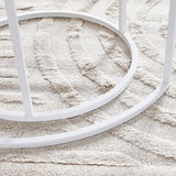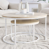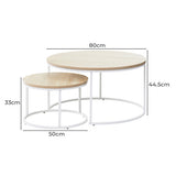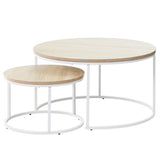 Features: Materials: powder-coated stainless steel frame, 1.8cm MDF with light oak melamine finish tabletop Includes: 1 x large coffee table, 1 x small coffee table, 1 x set of assembly parts, 1 x assembly manual Attractive addition to your living area Fusing Scandinavian & modern design styles, this set of nesting tables is a great fit in many spaces Offer generous surface space for books, magazines, remotes, cups, & decor items Sturdy & durable