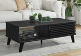Available in black, its slatted design adds a touch of modern elegance. The two doors open to reveal a spacious middle storage compartment, perfect for keeping your living space tidy. Supported by sturdy legs with a centre support, the table ensures stability while maintaining a minimalist aesthetic.
