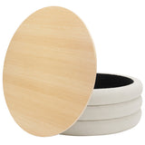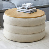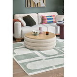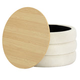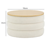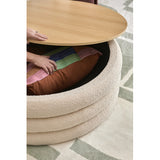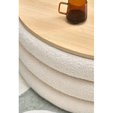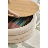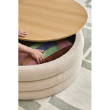 Features: Materials: eucalyptus wood and plywood frame, high-density foam fill, 100% polyester teddy (made from recycled PET bottles) upholstery, plywood with melamine finish lid, polypropylene foot pads Includes: 1 x ottoman Made from silky soft recycled teddy fabric 37 recycled PET bottles go into making one running metre of fabric A great additional storage space in your room Can also be used as a stool, side table, coffee table or footrest Oak-coloured top with a protective melamine finish provides a stable table that lifts off easily to reveal storage Lid thickness: 1.6cm