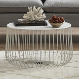 Features Table top Shape: Round Frame Material: Metal Tabletop Material: Metal Pieces in a Set: 1 Style: Contemporary  Assembly Assembly Required: No  Limited warranty Product Warranty: 3 Years  StyleThe Trevi Wire Coffee Table is a Contemporary style product. Contemporary style bridges the gap between traditional and modern. Pieces feature simple and clean lines with smooth surfaces without any carving or adornment. You can shop for more Contemporary Coffee Tables in the Furniture section of our site.