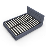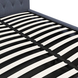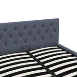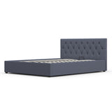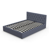 Features: Materials: rubberwood & steel frame, rubberwood legs, plywood slats, polyester upholstery, high density foam padding Includes: 1 x bed frame, 1 x headboard, 1 x assembly manual, 1 x set of assembly parts & screws Easy-to-use gas lift function allowing you to utilise all the space in your room Scandinavian-inspired tufted headboard Made of high-quality, breathable fabric & high density foam padding Strategically placed slats for support, durability & comfort Upholstery adds another layer of comfort Arrives flat packed with assembly instruction included For the gas lift bed to operate, a mattress must first be placed on the bed as the weight acts as a controllable trigger Clean & smooth edges provide the look of modern style Floor protectors included for convenience Heavy-duty metal connectors & steel construction for durability
