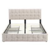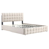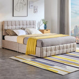Features: Materials: powder-coated steel frame & legs, plywood slats, polyester upholstery, middle-density foam padding, plain non-woven fabric bedhead back side Includes: 1 x platform bed, 1 x assembly kit, 1 x assembly manual Showcases a button tufted upholstered headboard which adds a contemporary chic look to your bedroom & layered in thick foam for extra comfort For more functionality, this bed comes with four drawers which can easily be pulled in & out for maximum storage space, perfect for organising anything from clothes & bed linens Made of wooden slats which provides dense & strong support Creates a strong foundation promoting long-lasting performance & good night sleep Contemporary & minimalist aesthetic to complement any bedroom décor Crafted with durable materials for long-lasting stability & support