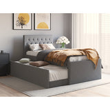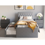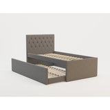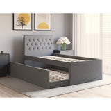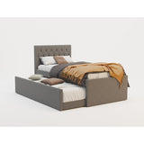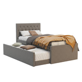 Features Size: King Single Type: Platform Bed Primary Material: UpholsteryMaterial Details: Pine wood frame, plywood slatsUpholstery Material: Polyester Upholstered: Yes Primary Colour: Light Grey; Dark Grey Mattress Included: No Gas Lift Mechanism: No Storage Included: Yes Trundle Included: Yes Bedhead Included: YesBedhead Design: Panel; Button TuftedBedhead Back Side Details: Black fabric Slats Included: Yes Maximum Weight Capacity: 200 Kilograms Style: Traditional; Country Age: Adult Box Contents: 1 x 1 x bed frame with trundle Care Instructions: Wipe clean with a dry clothCare Instructions Details: Clean with a dry cloth Assembly Assembly Required: YesType of Assembly: FullRecommended Persons Required for Assembly: 1Assembly Details: Full assembly required Limited warranty Product Warranty: 1 Year Specifications Consumer Advice: We strongly recommend using suitable floor protection to prevent damage to hard surface floors (e.g. a non-slip rug or non-slip furniture feet protectors). Regular checks to ensure that fixings are tight and the supporting legs remain securely in place is also required. StyleThe Corden King Single Bed with Trundle is a Traditional or Country style product. Traditional style furniture and decor tends to look heavy with an heirloom type quality.Common wood tones are darker shades of mahogany and walnut. Traditional style tends to feature pieces with tufted cushions and nailhead accents. You can shop for more Traditional or Country Beds in the Furniture section of our site.