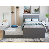Features Size: King Single Type: Platform Bed Primary Material: UpholsteryUpholstery Material: Linen Upholstered: Yes Primary Colour: Light Grey; Dark Grey Bedhead Included: YesBedhead Design: Rectangular Style: Contemporary Assembly Assembly Required: Yes Limited warranty Product Warranty: 1 Year Specifications Consumer Advice: We strongly recommend using suitable floor protection to prevent damage to hard surface floors (e.g. a non-slip rug or non-slip furniture feet protectors). Regular checks to ensure that fixings are tight and the supporting legs remain securely in place is also required. StyleThe Grey King Single Hazel Trundle Bed is a Contemporary style product. Contemporary style bridges the gap between traditional and modern. Pieces feature simple and clean lines with smooth surfaces without any carving or adornment. You can shop for more Contemporary Beds in the Furniture section of our site.
