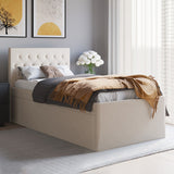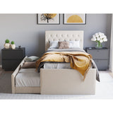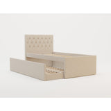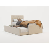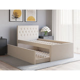 Features Size: King Single Type: Platform Bed Primary Material: UpholsteryMaterial Details: Pine wood frame, plywood slatsUpholstery Material: PolyesterUpholstery Material Details: Polyester hopsack fabricPadding Material: Foam Upholstered: Yes Primary Colour: White Mattress Included: No Gas Lift Mechanism: No Storage Included: Yes Trundle Included: Yes Bedhead Included: YesBedhead Design: Button TuftedBedhead Back Side Details: Black fabric Slats Included: YesSlats Materials Details: Plywood Maximum Weight Capacity: 200 Kilograms Style: Traditional; Country Age: Adult; Kids Box Contents: 1 x king single bed with trundle, 1 x set of assembly parts, 1 x assembly manual Collection: Griffiths Assembly Assembly Required: Yes Limited warranty Product Warranty: 1 Year Specifications Consumer Advice: We strongly recommend using suitable floor protection to prevent damage to hard surface floors (e.g. a non-slip rug or non-slip furniture feet protectors). Regular checks to ensure that fixings are tight and the supporting legs remain securely in place is also required. StyleThe Griffiths Upholstered King Single Bed with Trundle is a Traditional or Country style product. Traditional style furniture and decor tends to look heavy with an heirloom type quality.Common wood tones are darker shades of mahogany and walnut. Traditional style tends to feature pieces with tufted cushions and nailhead accents. You can shop for more Traditional or Country Beds in the Furniture section of our site.