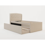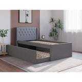 Features Size: King Single Type: Platform Bed Primary Material: UpholsteryMaterial Details: Pine wood frame, plywood slatsUpholstery Material: PolyesterUpholstery Material Details: Polyester hopsack fabricPadding Material: Foam Upholstered: Yes Mattress Included: No Gas Lift Mechanism: No Storage Included: Yes Trundle Included: Yes Bedhead Included: YesBedhead Design: Wingback; Button TuftedBedhead Back Side Details: Black fabric Slats Included: YesSlats Materials Details: Plywood Maximum Weight Capacity: 200 Kilograms Style: Traditional; Country Age: Adult; Kids Box Contents: 1 x king single bed with trundle, 1 x set of assembly parts, 1 x assembly manual Collection: Jordanov Assembly Assembly Required: Yes Limited warranty Product Warranty: 1 Year Specifications Consumer Advice: We strongly recommend using suitable floor protection to prevent damage to hard surface floors (e.g. a non-slip rug or non-slip furniture feet protectors). Regular checks to ensure that fixings are tight and the supporting legs remain securely in place is also required. StyleThe Jordanov Upholstered King Single Bed with Trundle is a Traditional or Country style product. Traditional style furniture and decor tends to look heavy with an heirloom type quality.Common wood tones are darker shades of mahogany and walnut. Traditional style tends to feature pieces with tufted cushions and nailhead accents. You can shop for more Traditional or Country Beds in the Furniture section of our site.