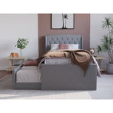 Features: Materials: pine wood frame, plywood slats, polyester hopsack fabric upholstery, foam padding Includes: 1 x king single bed with trundle, 1 x set of assembly parts, 1 x assembly manual Fits a standard king single size bed mattress 107 x 203cm Well padded & quality finish construction Trundle dimensions: W88 x D188cm Arrives flat-packed Modern design Trundle can fit up to a 15cm thick mattress Trundle comes with wheels to pull out easily Note: mattress & pillows not included