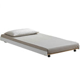 Features Size: Single Type: Trundle Only Primary Material: Solid Wood; Manufactured WoodMaterial Details: Rubberwood, MDF Primary Colour: White Mattress Included: No Gas Lift Mechanism: No Storage Included: No Trundle Included: Yes Bedhead Included: No Slats Included: YesSlats Materials Details: LVL flat slat base Maximum Weight Capacity: 90 Kilograms Style: Traditional; Country; Coastal Age: Adult Box Contents: 1 x set of trundle bed frame Care Instructions: Wipe clean with a dry clothCare Instructions Details: Wipe clean with a dry cloth Assembly Assembly Required: Yes Limited warranty Product Warranty: 1 Year Specifications Consumer Advice: We strongly recommend using suitable floor protection to prevent damage to hard surface floors (e.g. a non-slip rug or non-slip furniture feet protectors). Regular checks to ensure that fixings are tight and the supporting legs remain securely in place is also required StyleThe Leo Trundle is a Traditional or Country style product. Traditional style furniture and decor tends to look heavy with an heirloom type quality.Common wood tones are darker shades of mahogany and walnut. Traditional style tends to feature pieces with tufted cushions and nailhead accents. You can shop for more Traditional or Country Beds in the Furniture section of our site.