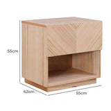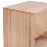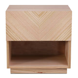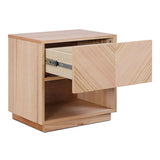 Features: Materials: MDF with ash wood veneer finish frame and tabletop, plywood drawer base, steel drawer runners Includes: 1 x bedside table, 1 x anti-topple kit Unique V-shape pattern on the drawer front adds a modern and eye-catching look Finished in natural ash wood veneer for an elegant and durable appearance One spacious drawer and an open shelf for versatile storage Compact and functional design fits perfectly beside a bed or sofa Durable construction ensures long-lasting use Smooth surface for easy cleaning and maintenance Fully assembled for immediate use
