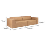Overall 70cm H x 240cm W x 95cm D Seat 43cm H x 196cm W x 60cm D Arm 60cm H x 22cm W Clearance from floor to bottom of Product 5cm Overall Product Weight 67 Kilograms Recommended Weight Capacity (Sofa) 500 Kilograms   ? ASSEMBLY INSTRUCTIONS