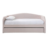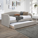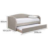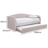 Features: Materials: MDF & particleboard frame, 100% polyester velvet upholstery Includes: 1 x daybed with trundle, 1 x assembly manual Turn your living room into a guest room in a snap with this daybed Pleated velvet upholstery Upholstered in polyester velvet in different colours, which suits all styles of home decoration Completes the look of any bedroom Ideal for small living spaces Easy to assemble Trundle dimensions: H23.5 x W193 x D97cm Note: mattresses are not included