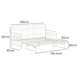 Features Size: Single Bed Type: Daybed Frame Material: MetalFrame Material Details: Powder-coated steel Legs Included: YesLegs Material: Powder-coated steel Mattress Included: No Trundle Included: Yes Seating Capacity: 2 Recommended Weight Capacity: 150 Kilograms Castors Included: Yes Arms Included: Yes Box Contents: 1 x daybed with trundle, 1 x assembly manual Care Instructions: Wipe clean with a dry cloth, do not use strong cleaners or chemicals Assembly Assembly Required: YesType of Assembly: FullRecommended Persons Required for Assembly: 2Assembly Details: Assembly instructions included with the product Limited warranty Product Warranty: 2 Years