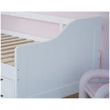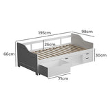 Features Size: Single Bed Type: Daybed Consumer Advice: We strongly recommend using suitable floor protection to prevent damage to hard surface floors (e.g. a non-slip rug or non-slip furniture feet protectors). Regular checks to ensure that fixings are tight and the supporting legs remain securely in place is also required Frame Material: Solid WoodFrame Material Details: Pine wood with painted finish Primary Colour: White Mattress Included: No Trundle Included: No Storage Included: Yes Recommended Weight Capacity: 120 Kilograms Castors Included: Yes Pattern: Solid Box Contents: 1 x daybed with storage, 1 x set of assembly parts, 1 x assembly manual Care Instructions: Wipe clean with a cloth Assembly Assembly Required: YesType of Assembly: MinimalRecommended Persons Required for Assembly: 1Tools required & NOT provided: ScrewdriverAssembly Details: Assembly instructions included with the product Limited warranty Product Warranty: 12 Months