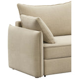 Features: Materials: plywood frame, 100% polyester fabric upholstery, polypropylene & polyethylene plastic legs, high-density foam seat padding, polyester fibre back padding, no-sag springs & webbing seat suspension Includes: 1 x sofa bed, 2 x throw cushions, 1 x assembly manual Offers a comfortable & relaxing resting experience, whether as a sofa or when fully reclined Padded mattress topper for added comfort Folds out into a double bed Upholstered in a textured fabric We recommend fluffing cushions daily to maintain their shape, to ensure longer life, & to create a fuller & more plump appearance