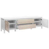 Features Type: TV Cabinets Frame Material: Manufactured Wood Drawers Included: YesNumber of Drawers: 2Drawer Material: Particleboard with white lacqueringDrawer Runners Material: Metal Cabinets Included: YesNumber of Doors: 2Number of Interior Shelves: 4Interior Shelf Material: Particleboard with white lacqueringAdjustable Interior Shelves: Yes Cable Hole Included: YesNumber of Cable Holes: 2 Primary Colour: White; Light Wood Style: Contemporary; Scandinavian Collection: Kingscliff Topple Risk: Yes Anti-Topple Anchors Included: Yes Care Instructions: Always use coasters or placemats to protect the table surface; remove any liquid spills immediately using a clean cloth or kitchen roll sheet & mild detergent  Assembly Assembly Required: YesType of Assembly: FullRecommended Persons Required for Assembly: 2  Limited warranty Product Warranty: 3 Years  StyleThe 180cm Whitewash Kingscliff TV Unit is a Contemporary or Scandinavian style product. Contemporary style bridges the gap between traditional and modern. Pieces feature simple and clean lines with smooth surfaces without any carving or adornment. Scandinavian style is exemplified by clean-lines, simple, and functional. Scandinavian interiors feature bright white on floors, fabrics, and walls.While, unpainted, light wood furniture that embraces the natural grain adds much-needed warmth to spaces. Sleek, utilitarian furniture without much embellishmentis a mainstay in this minimalist style with a modern flair. You can shop for more Contemporary or Scandinavian TV Units in the Furniture section of our site.