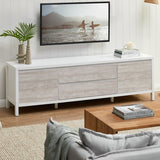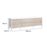 Features: Materials: MDF with white lacquering frame, metal drawer runners Includes: 1 x TV unit, 1 x assembly parts, 1 x manual 2 x cabinets with adjustable or removable interior shelves, making it easy to store your household items 2 x drawers provide additional storage space 2 x cable holes included on the rear for tidy organisation of electrical devices Metal drawer runners ensure a smooth open & close Coastal-inspired look with easy-to-clean white lacquering 3D printed drawer face in a whitewash finish Anti-topple anchors included for your peace of mind Elevated design makes it easy to occasionally dust or vacuum underneath Tabletop: H40 x W180 x D40cm We've tested it for you - the surface is resistant to liquids & staining, just be sure to wipe up spills as soon as possible  WARNING Children have died from furniture toppling over Always secure your television with an anchor deviceNever allow children to stand, climb or hang on drawers, doors, or shelves