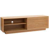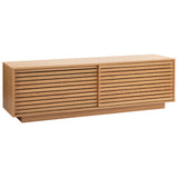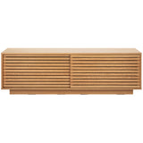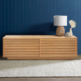 Features: Materials: 18mm particleboard with solid pine slats in a white oak veneer finish, clear lacquer Includes: 1 x TV unit, 1 x set of assembly parts, 1 x manual Two sliding doors give you the option to keep one side open or both closed for a full enclosure Platform base gives a neat & tidy floating look that suits modern interiors Solid pine slats in an oak veneer finish invite lovely wood grain texture & visual dimension to your home 4 x interior shelves offer ample storage space for all your entertainment needs Keep your electronic cords neat & organised with 2 x cable management holes on the back WARNING Children have died from furniture toppling over Always secure your television with an anchor deviceNever allow children to stand, climb or hang on drawers, doors, or shelves