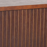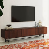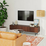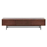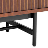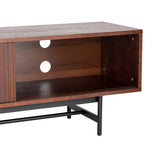 Features: Materials: MDF with walnut stained oak veneer finish frame, plywood back panel, powder-coated iron legs Includes: 1 x TV unit Mid-century modern style 3D grooved panels - or fluting - on the central door Multiple cable holes for organised electronic storage Strong, black powder-coated iron legs Sliding doors allow you to choose to have an open space for media storage We've tested it for you - the surface is resistant to liquids & staining, just be sure to wipe up spills as soon as possible WARNING Children have died from furniture toppling over Always secure your television with an anchor deviceNever allow children to stand, climb or hang on drawers, doors, or shelves