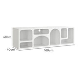 Features: Materials: MDF frame with lacquer finish Includes: 1 x TV unit, 1 x anti-topple kit, 1 x assembly manual Multiple open shelves for organised media storage and décor display Cable management holes for a clean and tidy setup Rounded edges for a smooth, seamless look Unique curved design adds a modern, sculptural look Open-shelved with its curved design Ideal for living rooms, entertainment areas, or media spaces WARNING Children have died from furniture toppling over Always secure your television with an anchor deviceNever allow children to stand, climb or hang on drawers, doors, or shelves