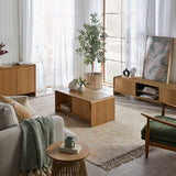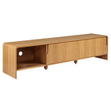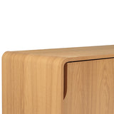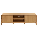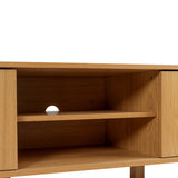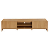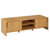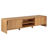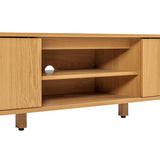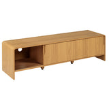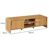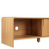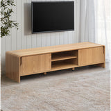 Features: Materials: MDF with laminate finish frame, particleboard with laminate finish shelves Includes: 1 x entertainment unit, 1 x set of assembly parts, 1 x assembly manual Curved waterfall edges lend the piece a modern feel Beautiful sliding doors are ideal in smaller rooms so doors don't encroach on floorspace Showcases a beautiful oak-coloured finish 2 x adjustable open shelves 2 x internal shelves for discreet storage to keep clutter out of sight A cable management hole in the centre for neat cord arrangement We've tested it for you - the surface is resistant to liquids & staining, just be sure to wipe up spills as soon as possible WARNING Children have died from furniture toppling over Always secure your television with an anchor deviceNever allow children to stand, climb or hang on drawers, doors, or shelves