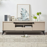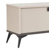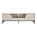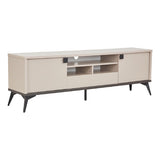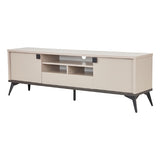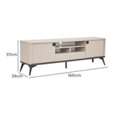 Features Type: TV Lowlines Frame Material: Manufactured Wood Drawers Included: YesNumber of Drawers: 1Drawer Material: MDF with melamine finishDrawer Runners Material: Stainless steel Soft Close Drawers: Yes Cabinets Included: YesNumber of Doors: 2Number of Interior Shelves: 2 Open Shelves Included: YesNumber of Open Shelves: 3Open Shelf Material: MDF with melamine finish Cable Hole Included: YesNumber of Cable Holes: 1 Recommended Weight Capacity: 80 Kilograms Primary Colour: Beige; Dark Wood Style: Mid Century Powder Coated Finish: Yes Box Contents: 1 x entertainment unit, 1 x set of assembly parts, 1 x assembly manual Collection: Bardo Topple Risk: Yes Care Instructions: Wipe clean with a damp cloth  Assembly Assembly Required: YesType of Assembly: FullRecommended Persons Required for Assembly: 2Assembly Details: Assembly instructions included with the product  Limited warranty Product Warranty: 1 Year  Specifications Commercial Use: Yes