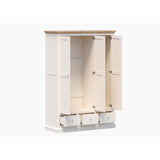 Features: Materials: foil laminated particleboard, MDF, metal runners, aluminium handles Includes: 1 x wardrobe, 1 x assembly manual It offers a seamless fusion of classic & contemporary design Boasts a clean, white finish complemented by a natural wood tone top, bringing a rustic charm Simple yet elegant panels & metallic handles, open to reveal a spacious interior complete with shelving & hanging space, thoughtfully designed to accommodate a variety of storage needs The drawers slide out smoothly, offering additional organisation for smaller garments & accessories WARNING Children have died from furniture toppling over Always secure this furniture with an anchor deviceNever allow children to stand, climb or hang on drawers, doors, or shelvesNever open more than one drawer at a timePlace heavy items down lowNever place a television on this furniture