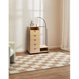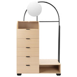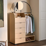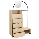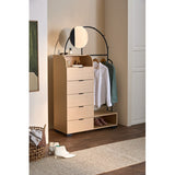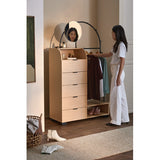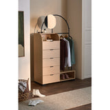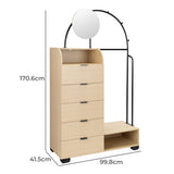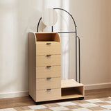 Features: Materials: particleboard & glossy powder-coated iron frame, pine wood legs, particleboard drawers, cast iron drawer runners, carbon steel handles, tempered glass mirror, particleboard with oak melamine finish shelves, rubber foot pads Includes: 1 x wardrobe, 1 x mirror, 1 x hardware pack, 1 x anti-topple kit, 1 x assembly manual Great for extra clothes storage when you have limited space With three hooks to hang accessories & bags Clever storage with five drawers, two shelf spaces, one mirror & clothes rack Suits any contemporary bedroom or entryway perfectly Exclusively designed in-house by Temple & Webster WARNING Children have died from furniture toppling over Always secure this furniture with an anchor deviceNever allow children to stand, climb or hang on drawers, doors, or shelvesNever open more than one drawer at a timePlace heavy items down lowNever place a television on this furniture